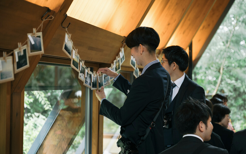 チャペルに入ると、中には封筒のガーランドが。準備期間中に用意したゲスト一人ひとりへの手紙です。ゲストがおふたりにとってどんな存在か、これまでにつけてくれた足跡がいかに大切かをしたため、思い出の写真も同封。封筒の表にも新郎様が撮影した写真を貼り、写真展のような空間を演出しました。